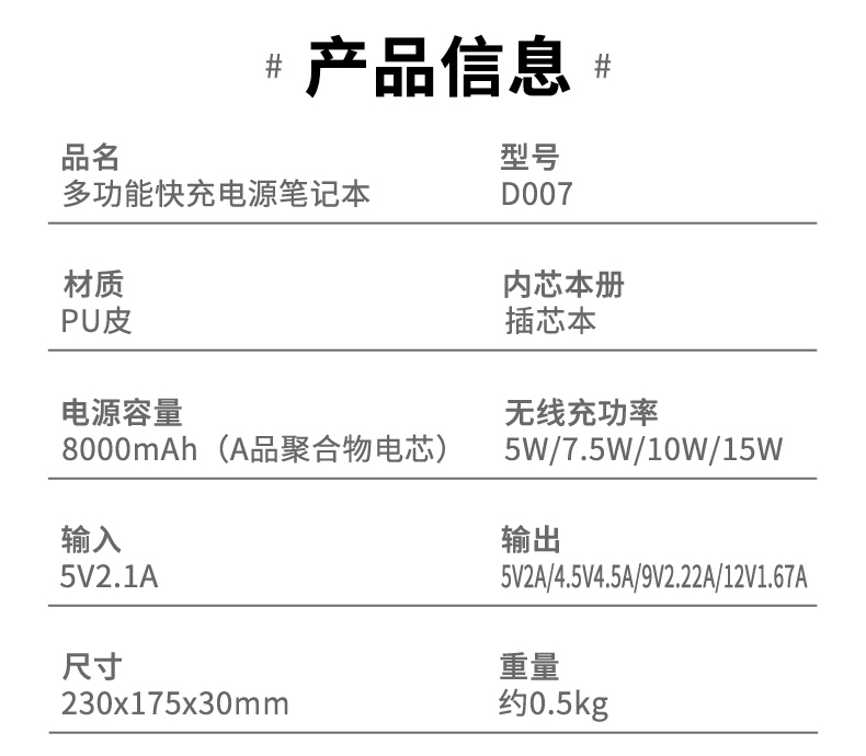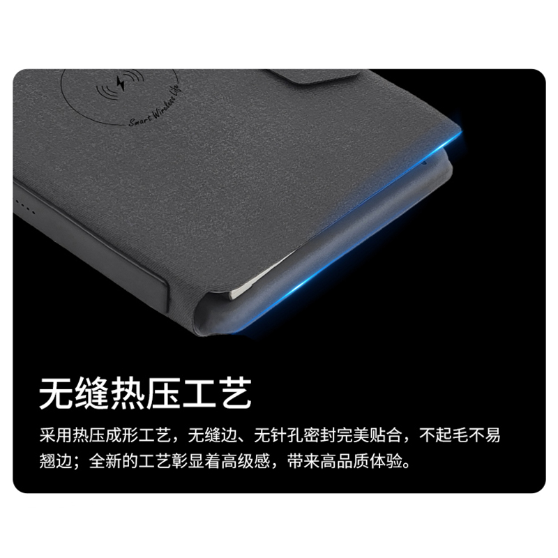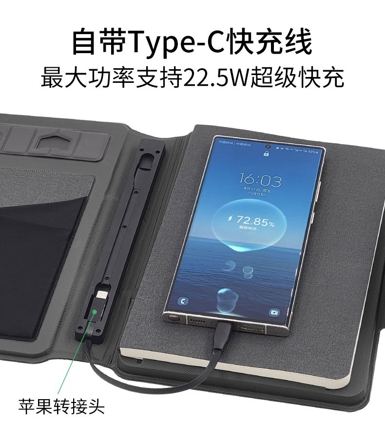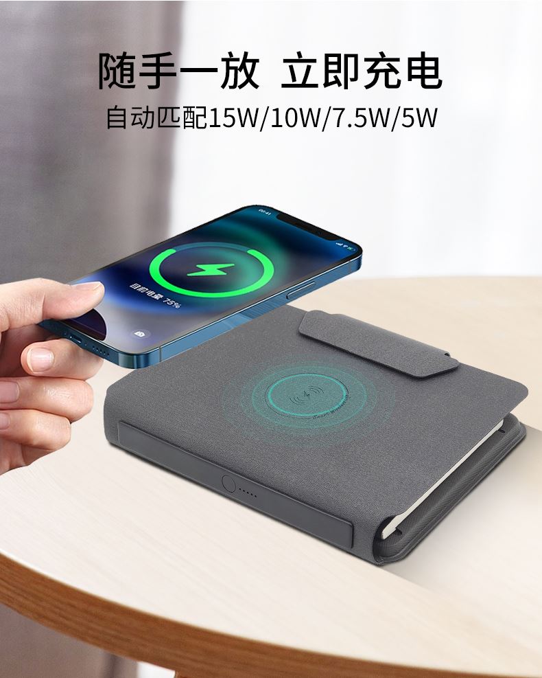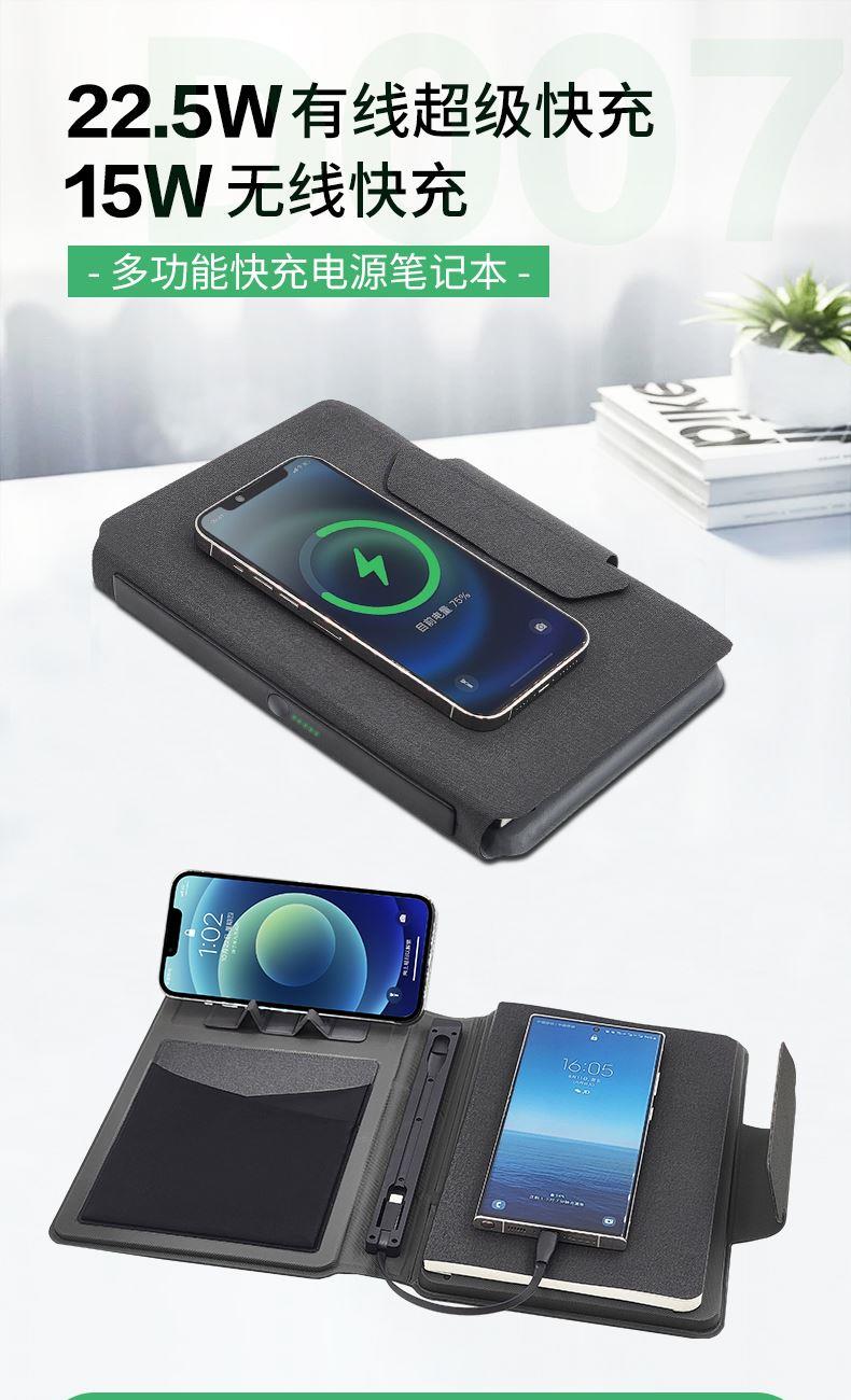 产品描述: 配置:无线充+8000毫安电源+充电线+插芯本 产品型号:D007 无线充:15W/10W/7.5W/5W 输入输出:5V.2A 输入输出接口:type-c 笔记本尺寸:230x175x30mm 插芯本: 207x142x11mm 产品重量:0.5kg 产品颜色:黑色 重量:31KG/箱 内置8000毫安移动电源,15W(Max)无线充,有线充输出的功率可高达15W,充电速度更快。苹果转接头、自带Type-C输入输出线,充电更便携。 热压成形工艺,无缝线无针孔不易翘边;使成品彰显质感,带来全新的高品质体验。。 内页采用象牙白纸,书写顺畅,不易渗墨。 魔术贴支架设计,可做手机支架使用。 手机,票据收纳袋,轻松收纳办公小物件。