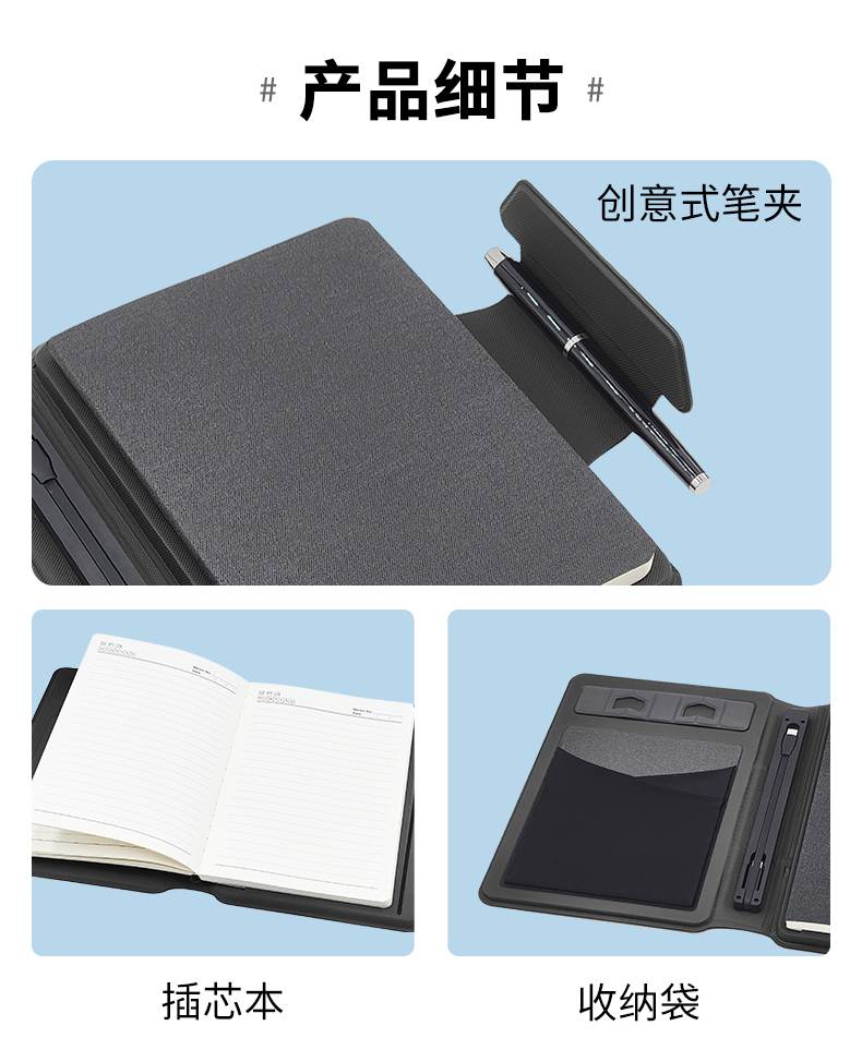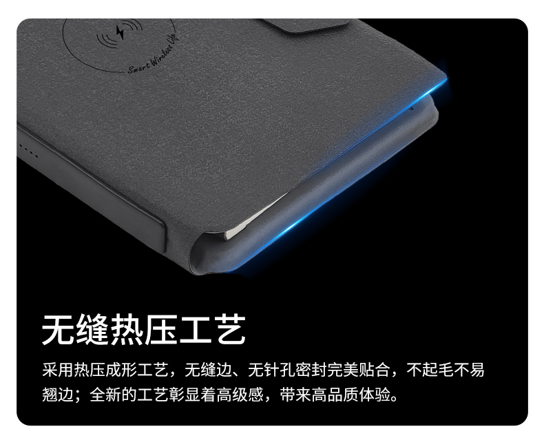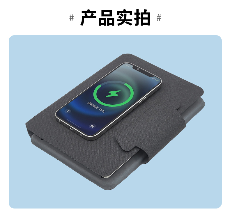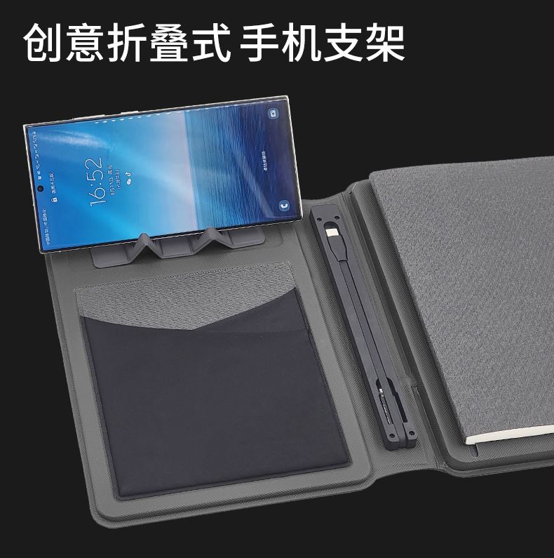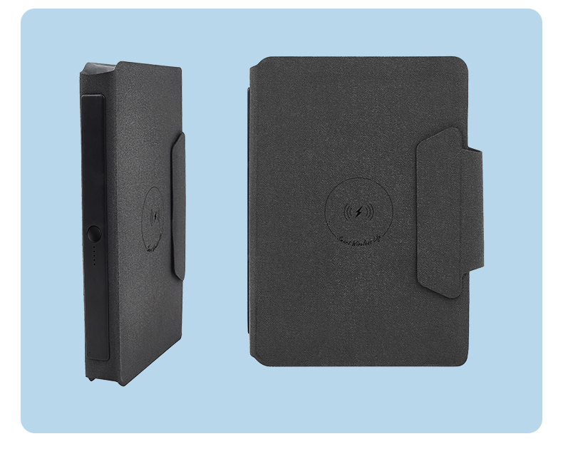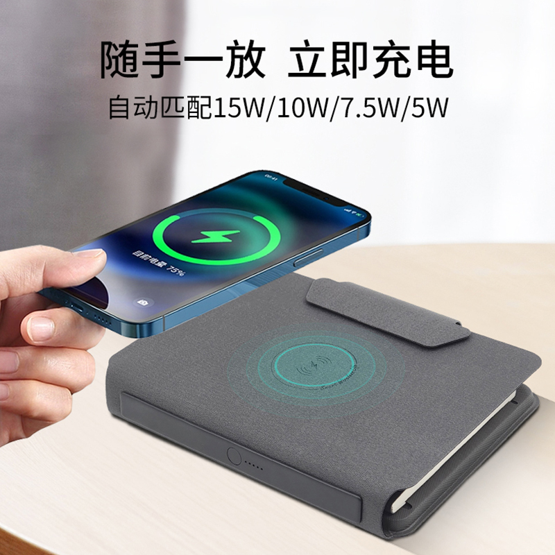 产品描述: 配置:无线充+8000毫安电源+充电线+插芯本 产品型号:D007 无线充:15W/10W/7.5W/5W 输入输出:5V.2A 输入输出接口:type-c 笔记本尺寸:230x175x30mm 插芯本: 207x142x11mm 产品重量:0.5kg 产品颜色:黑色 重量:31KG/箱 内置8000毫安移动电源,15W(Max)无线充,有线充输出的功率可高达15W,充电速度更快。苹果转接头、自带Type-C输入输出线,充电更便携。 热压成形工艺,无缝线无针孔不易翘边;使成品彰显质感,带来全新的高品质体验。。 内页采用象牙白纸,书写顺畅,不易渗墨。 魔术贴支架设计,可做手机支架使用。 手机,票据收纳袋,轻松收纳办公小物件。